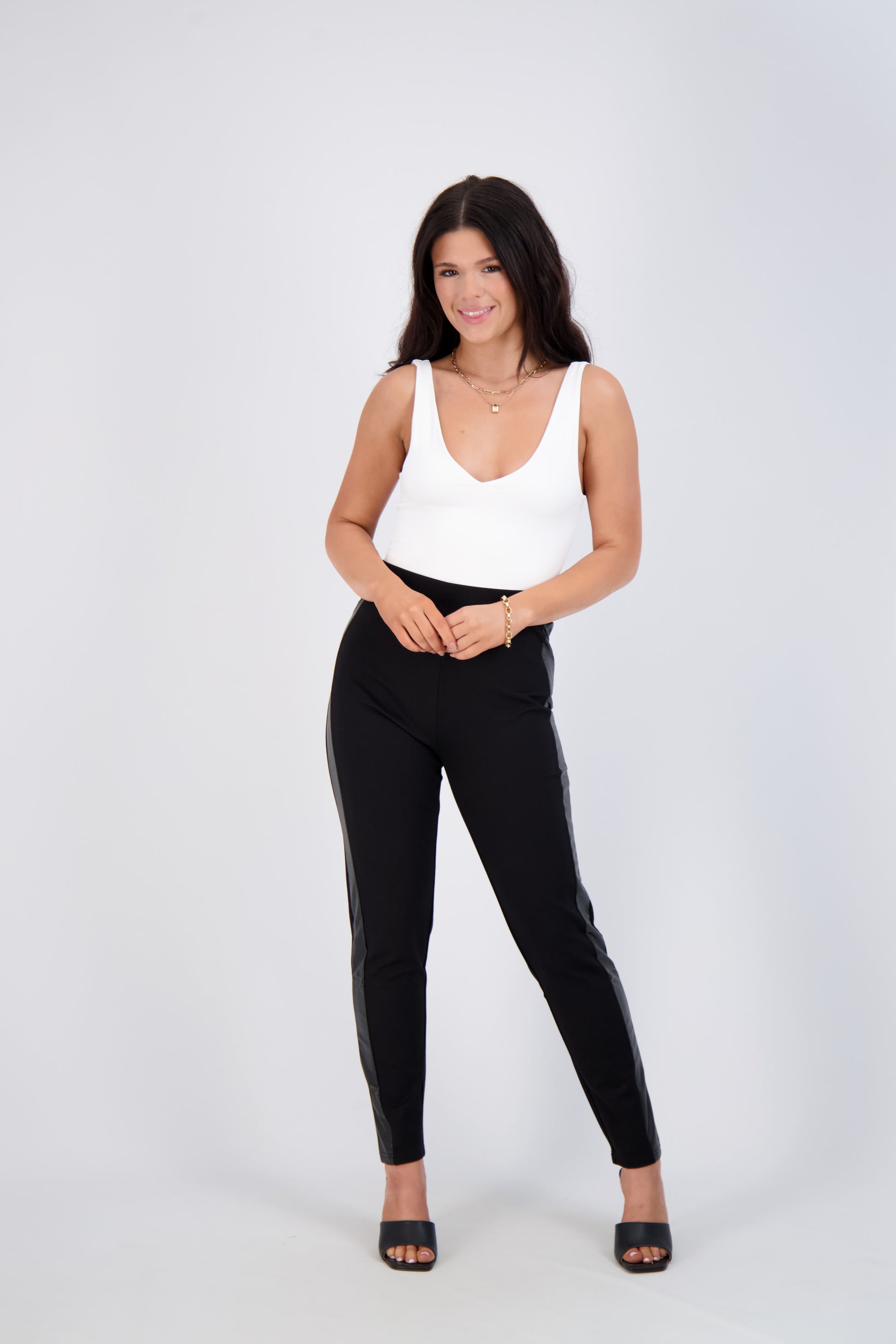 Add a trendy twist to your wardrobe with these High-Waist Faux Leather Side Stripe Slim-Fit Pants. Featuring sleek faux leather side stripes, these pants offer a modern and edgy look. The high-waist design accentuates your figure, while the slim-fit cut provides a flattering silhouette. Made from a stretchy and comfortable fabric, these pants are perfect for all-day wear. Ideal for both casual and night-out occasions, pair them with a chic blouse and heels for a polished look or with a casual top and sneakers for a laid-back yet stylish ensemble.